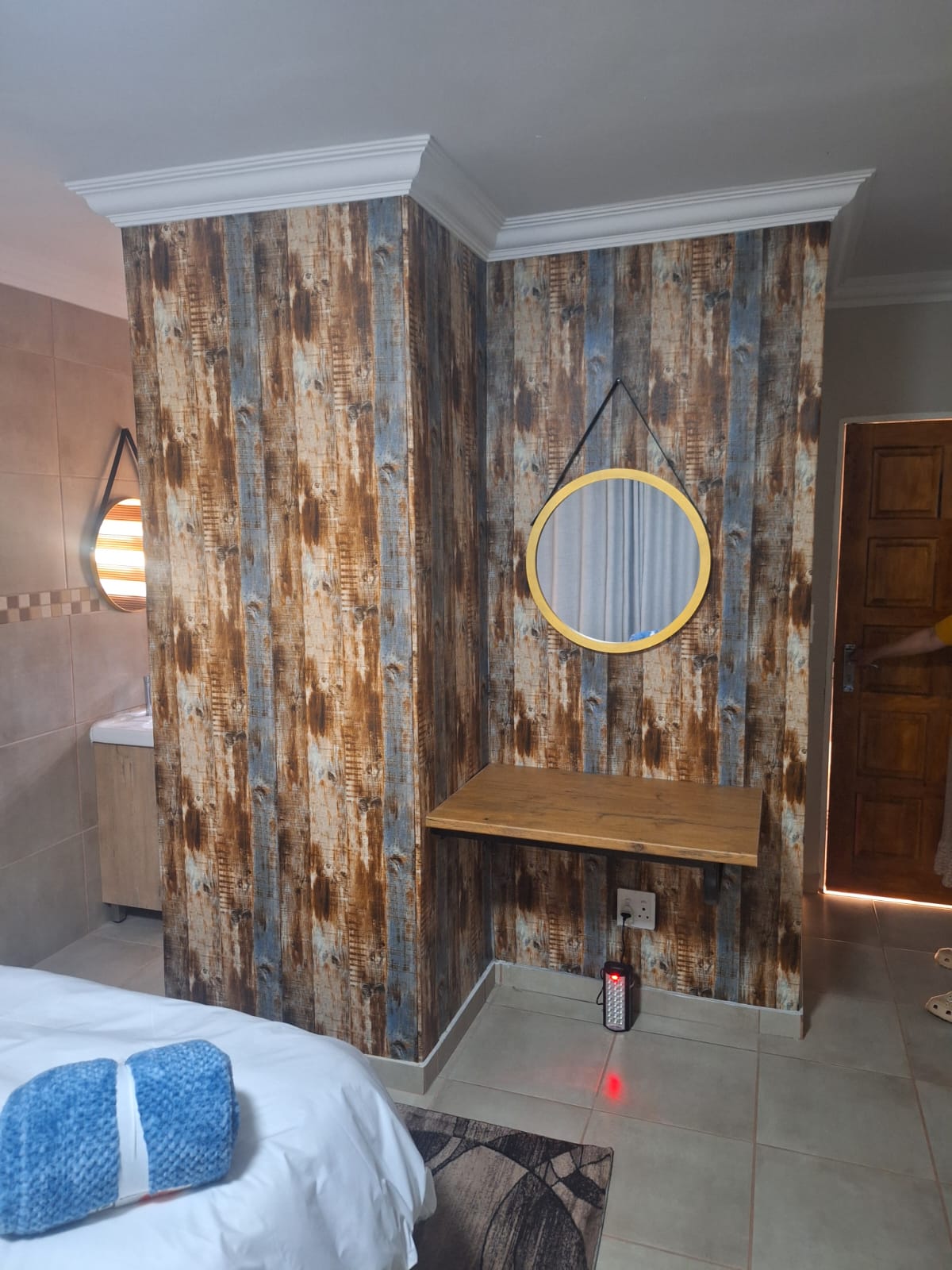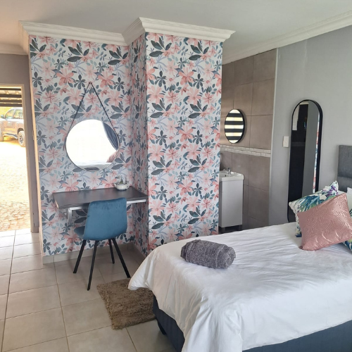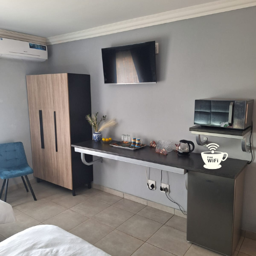 Accomodates two people sharing King size bed. Ideal for travelers with partners. Equipped with a microwave, kettle and mini fridge. Fibre WiFi available to access the internet and to connect to the Smart TV to login to own accounts like Netflix, Showmax etc. Smart Aircon to control temperature. Bathroom with shower and we make use of a French drainage system, please no foreign objects to be flushed.